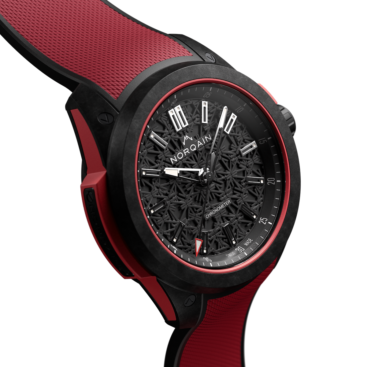Dieses exklusive Modell, das in einer Auflage von nur 25 Stück produziert wird, verkörpert die Essenz der Wild ONE Kollektion. Es vereint Leichtigkeit, Widerstandsfähigkeit und Innovation. Das Gehäuse besteht aus NORTEQ®, einem von NORQAIN exklusiv aus Carbonfasern entwickeltem Material, ist ultraleicht, antimagnetisch und kratzfest. Das integrierte Dämpfungssystem aus Gummi sorgt für maximalen Schutz vor Erschütterungen. Die Uhr montiert ein COSC-zertifiziertes Manufakturwerk von Kenissi und ist bis 200 Meter wasserdicht.